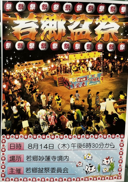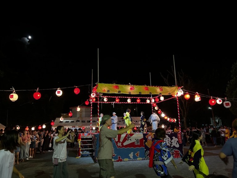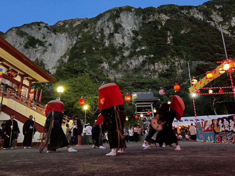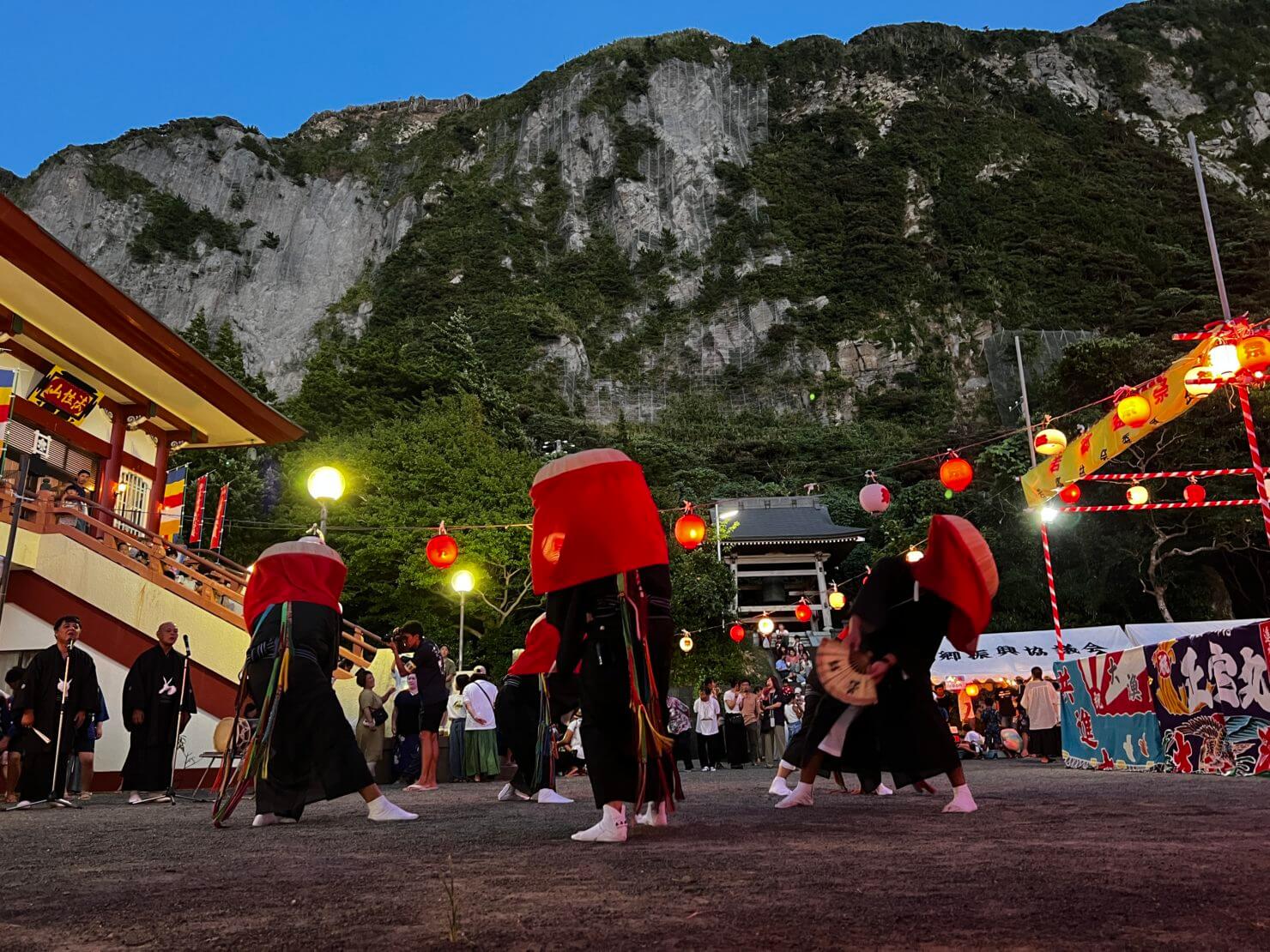 若郷は毎年この日に行われる地域の夏祭り「若郷盆祭」で披露されています。境内では中央にやぐらが立ち、奥にフードやドリンクなどの出店がずらり。住民による踊りや太鼓などの出し物、お盆といえばこれ!の輪踊りなど、イベントももりだくさん。提灯のあたたかなあかりと笑顔があふれ、そこにいるだけで楽しい気持ちになるお祭りです。
