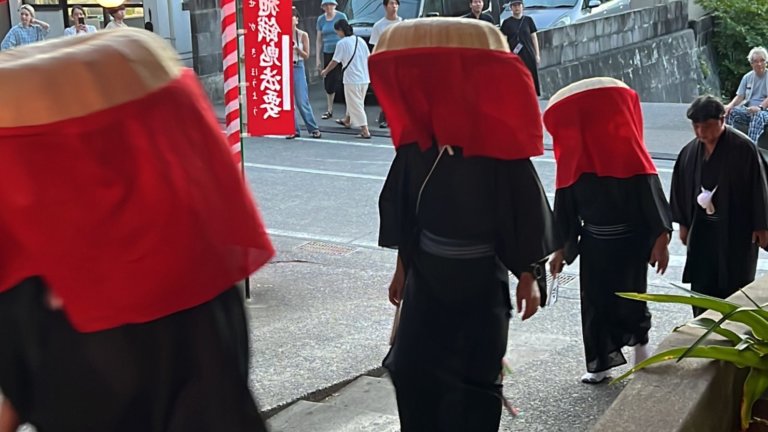 大踊は祭りのオープニングに登場。6時半ごろ、赤いカバ(かぶり布)をたっぷりと垂らした踊り衆が、道路から出入口の短い坂道を上って境内に入ってきます。